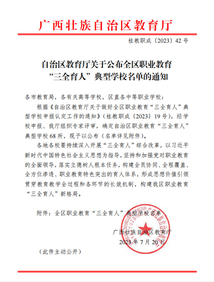近日,自治區(qū)教育廳公布全區(qū)職業(yè)教育“三全育人”典型學(xué)校名單,廣西第一工業(yè)學(xué)校名列其中。