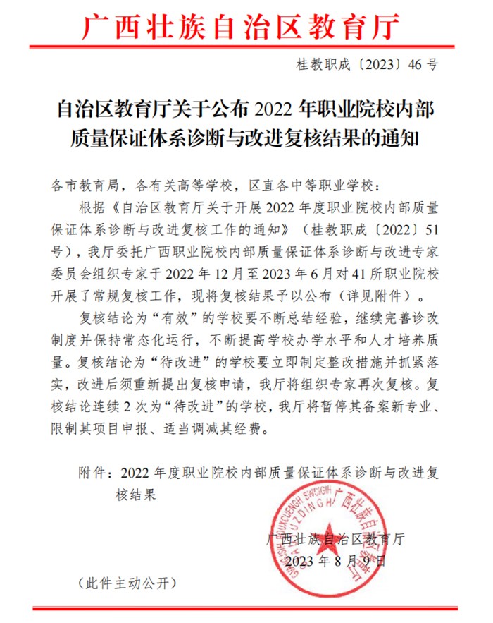 近日,自治區(qū)教育廳印發(fā)《自治區(qū)教育廳關(guān)于公布2022年職業(yè)院校內(nèi)部質(zhì)量保證體系診斷與改進(jìn)復(fù)核結(jié)果的通知》(桂教職成〔2023〕46號(hào)),經(jīng)審定,我校內(nèi)部質(zhì)量保證體系診斷與改進(jìn)復(fù)核結(jié)論為“有效”,順利通過(guò)復(fù)核。