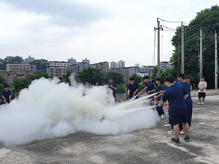 最后,謝政熙警官和韋東菊警官在學校消防實訓基地指導學生使用滅火器,學生積極學習滅火步驟及器械使用方法,并進行操作,提升滅火技能。