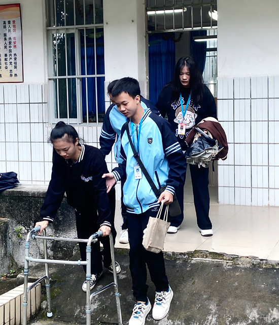 學(xué)生主動(dòng)幫助行動(dòng)不便的同學(xué)