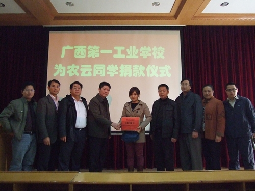 “感謝一工校的老師同學(xué)們!你們雪中送炭的行動(dòng)讓我們?nèi)毅懹浽谛?hellip;…”1月23日上午,農(nóng)云同學(xué)的姐姐農(nóng)慈珍激動(dòng)地接過(guò)一個(gè)紅色的大信封,這是廣西第一工業(yè)學(xué)校的師生們?yōu)榘籽』颊咿r(nóng)云同學(xué)募捐所得的18218元。近日,廣西第一工業(yè)學(xué)校師生為該校一位突患白血病的學(xué)生進(jìn)行捐款,點(diǎn)點(diǎn)愛(ài)心匯聚一起,千余名師生聚合正能量向他伸出了援助之手。