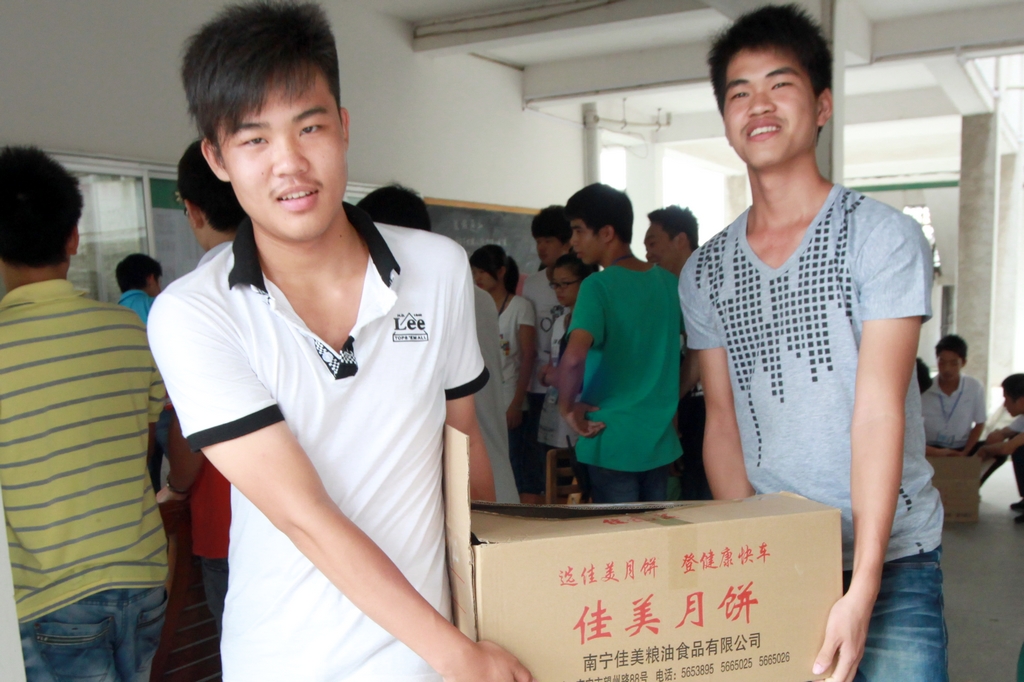 9月27日下午,由學(xué)校后勤部門向全體學(xué)生發(fā)放月餅。班干們把一箱箱月餅抬到班上,同學(xué)們領(lǐng)到月餅,喜上眉梢。