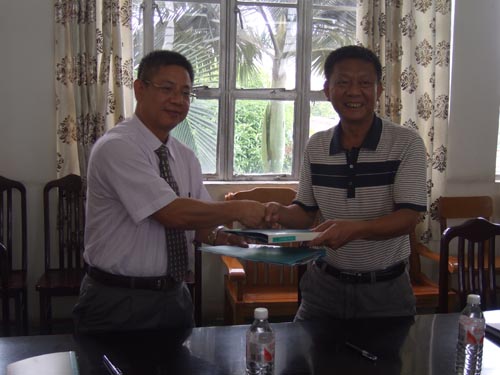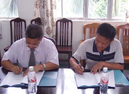 東芝家用電器制造(南海)公司總務(wù)部胡忠部長(左)與勞副校長代表雙方簽訂合作協(xié)議