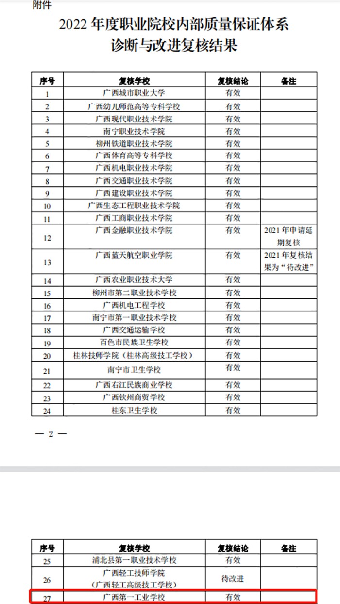 近日,自治區(qū)教育廳印發(fā)《自治區(qū)教育廳關(guān)于公布2022年職業(yè)院校內(nèi)部質(zhì)量保證體系診斷與改進(jìn)復(fù)核結(jié)果的通知》(桂教職成〔2023〕46號(hào)),經(jīng)審定,我校內(nèi)部質(zhì)量保證體系診斷與改進(jìn)復(fù)核結(jié)論為“有效”,順利通過復(fù)核。